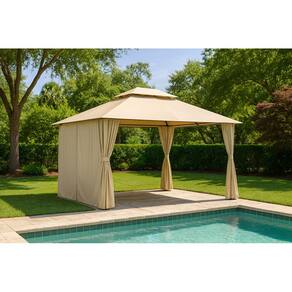 A cobertura em poliester de alta qualidade protege contra o sol e o vento, enquanto as cortinas laterais inclusas proporcionam charme extra a decoracao e mais privacidade para seus momentos de lazer.