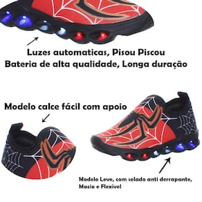 Tenis de Led Infantil Para Meninos Aranha com Pulseira O queridinho da criançada chegou para arrasar, seja luz, luzinha, led ou pisca-pisca, os pequenos amam! Tênis de Led Infantil Heroi Aranha, com luzinhas coloridas na sola e design moderno e estiloso. O cabedal com elastano proporciona um ajuste perfeito aos pés e auxilia no momento de calçar. Além de trazer todo o conforto que os pequenos precisam para o dia a dia também possui solado flexível e anti derrapante. Sem contar que é super divertido e estiloso!!