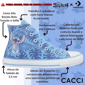 O clássico Chuck Taylor All Star na versão kids O clássico Chuck Taylor All Star na versão kids recebeu um toque de mágica na colaboração Converse x Disney. Para celebrar uma das animações mais amadas nos últimos 22 anos, Lilo & Stitch, a Converse apresenta a coleção Stich, trazendo referências à criaturinha mais fofa do mundo cinematográfica, para o dia a dia. Confeccionado em tecido tipo lona de algodão, o modelo traz o Stitch aplicado na lateral externa e sobreposto à uma uma padronagem de folhas, costuras duplas, forro interno acolchoado para maior conforto e dois ilhoses laterais para uma transpiração adequada aos pés. O Patch Logo com assinatura Converse Chuck Taylor All Star é aplicado na parte interna dos canos, enquanto o logo Converse All Star é aplicado na heeltab do calcanhar. O solado vulcanizado garante a aderência adequada ao caminhar.