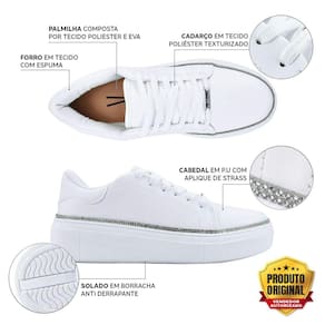 O tênis casual Vizzano 1339.517 dá destaque para as faixas de strass contornando o solado. O fechamento é em cadarço que facilita o ajuste.
