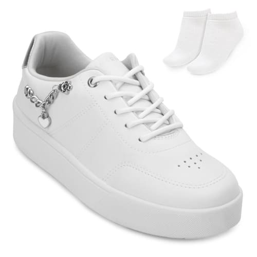 Nome: Tênis Casual Ramarim e Meia RM24-24831. Gênero: Feminino. Indicado Para: Moda-Dia a Dia. Ocasião: Casual. Material Externo: Alternativo. Material Interno: Têxtil. Detalhe: Corrente com pingente de coração na lateral externa. Recorte e costura metalizado com logo da marca na parte de trás. Fechamento: Cadarço. Palmilha: EVA forrada e macia. Altura do Solado: 4 cm. Solado: Borracha antiderrapante. Peso do Produto: 931 kg (o peso varia de acordo com a numeração). Garantia do Fabricante: Contra defeito de fabricação. Origem: Nacional. Código Produto: 02024755. Marca: Ramarim. Acompanha um par de meias tamanho 33 / 38. Composição: 83 % Algodão. 12 % Poliéster. 05 % Elastodieno.