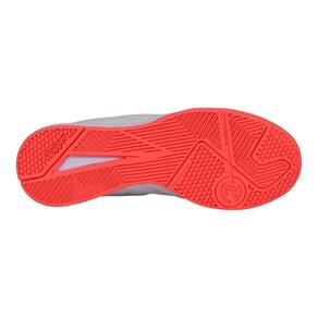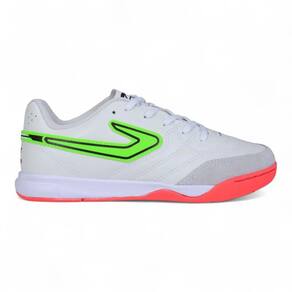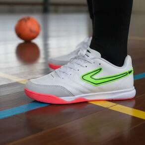 Sua sola de borracha é especialmente projetada para superfícies indoor, garantindo tração e aderência em movimentos rápidos, enquanto as travas de futsal favorecem um controle de bola superior. O fechamento em cadarços proporciona um ajuste personalizado, essencial para garantir firmeza e segurança durante os jogos.