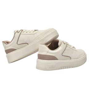 O cabedal apresenta acabamento detalhado com costuras visíveis que realçam o estilo do modelo, além de um passador exclusivo que carrega o nome da marca, agregando um charme discreto ao visual.