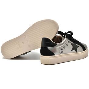 O design lateral em estrela e tachas cria uma combinação perfeita de estilo e personalidade, elevando o visual do tênis a outro nível.