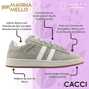 Se você busca um tênis que una sofisticação, conforto e praticidade, o Tênis Feminino Casual Rayssa da Marina Mello é a escolha perfeita! Feito em camurça de alta qualidade e toque macio, ele traz um visual moderno e elegante, perfeito para compor looks versáteis e cheios de estilo.