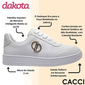 O Tênis Dakota Casual é o equilíbrio perfeito entre atitude e conforto, pensado para mulheres que não abrem mão de estilo mesmo nas produções mais básicas. Com um design contemporâneo e detalhes que enriquecem o visual, ele transforma qualquer look com facilidade e autenticidade. Leve, com apenas 0,663 kg, garante bem-estar durante todo o dia, acompanhando sua rotina com suavidade e praticidade. A sola flatform de 2 cm proporciona estabilidade e eleva a silhueta na medida certa, enquanto o fechamento prático, aliado aos cadarços ajustáveis, permite um encaixe seguro que se adapta ao formato dos pés.