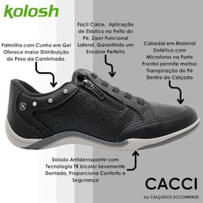 De calce fácil, traz elásticos e um zíper funcional lateral, para melhor ajuste e conforto, além de pequenos microfuros na região frontal, permitindo melhor transpiração do pé no calçado. Conta também com a tecnologia da palmilha com cunho em gel, com maior absorção de impacto durante a pisada, atuando na melhor distribuição do peso e auxiliando na postura corporal.