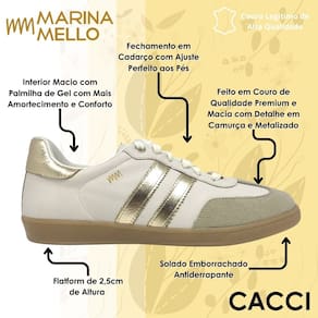 O Tênis Feminino Casual Emma da Marina Mello chegou para agregar ainda mais conforto, estilo e versatilidade ao seu guarda-roupa! Feito em couros premium macios, ele combina com diversos looks e oferece aquele toque de sofisticação que você tanto procura. Disponível em variações com detalhes em camurça e metalizado, o modelo é perfeito para quem gosta de unir o melhor dos dois mundos: elegância e praticidade!