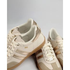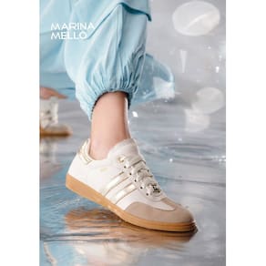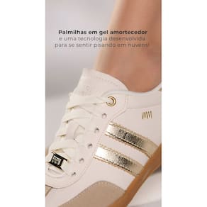 O Tênis Marina Mello Emma Creme detalhe dourado combina estilo e conforto em um design sofisticado.O cabedal é confeccionado em couro de alta qualidade, complementado por recortes e detalhes de camurça, conferindo um visual elegante e moderno.O fechamento com cadarço oferece um ajuste seguro e personalizado, enquanto o solado emborrachado garante durabilidade e aderência em diferentes superfícies.As palmilhas são desenvolvidas em E.V.A e possuem gel amortecedor, proporcionando um conforto superior e absorção de impactos, ideal para uso prolongado. Altura da sola: 2,4cm Material: Couro Medidas da palmilha: 33 22,4CM 34 23,4CM 35 23,6CM 36 24,2CM 37 24,8CM 38 25,4CM 39 26CM 40 26,6CM