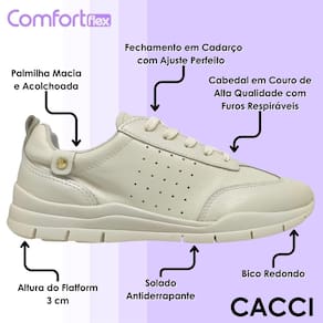 O tênis feminino flatform da ComfortFlex entrega o equilíbrio perfeito entre conforto e estilo para quem não abre mão de bem-estar no dia a dia. Seu cabedal é confeccionado com material de alta qualidade e possui pequenos furos respiráveis, que ajudam a manter os pés frescos mesmo após horas de uso. O fechamento em cadarço garante ajuste firme e personalizado, ideal para acompanhar sua rotina com segurança.