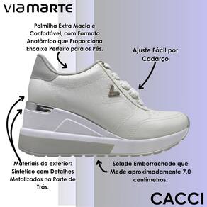 O tênis Via Marte foi desenvolvido para mulheres que valorizam conforto, estilo e modernidade em todas as ocasiões do dia a dia. Com design marcante e detalhes sofisticados, é uma peça versátil que combina com produções casuais, passeios descontraídos, compromissos urbanos e até mesmo ambientes que pedem um visual mais arrumado sem abrir mão do bem-estar. Seu exterior é confeccionado em material sintético de alta qualidade com acabamentos metalizados na parte traseira, que proporcionam um toque de elegância e originalidade. A palmilha extra macia possui formato anatômico que garante um encaixe perfeito, promovendo máximo conforto mesmo após longos períodos de uso. O ajuste é feito com cadarço, permitindo adaptação ideal aos pés e mais segurança ao caminhar. O solado emborrachado tem altura aproximada de 7 cm, oferecendo elevação na medida certa para valorizar a silhueta com estabilidade, enquanto sua base com tecnologia antiderrapante proporciona segurança e firmeza em diferentes tipos de superfícies. Este modelo é ideal para quem deseja se destacar com autenticidade e funcionalidade, sendo o equilíbrio perfeito entre design moderno, conforto absoluto e versatilidade para acompanhar sua rotina com muito estilo.