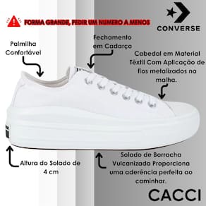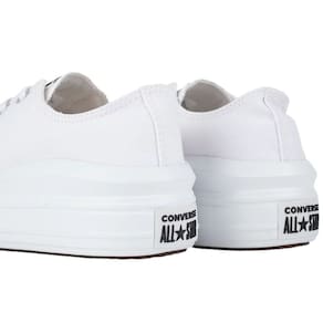 O All Star Move é construído sobre uma sola plataforma ultra-leve e confeccionado em tecido canvas de algodão tipo lona. O modelo possui costuras duplas e borracha contrastando com o tecido. Para complementar o conforto, o calçado possui palmilhas em PU feitas com Die-Cut, unidas ao solado plataforma com aproximadamente 5cm de altura (podendo variar conforme o tamanho do tênis) estilo cupsole, feito em EVA, que garante um conforto levíssimo. Tudo isso com a Heel Logo aplicada no calcanhar com a assinatura Converse All Star, garantindo um caminhar nas alturas e cheio de conforto.