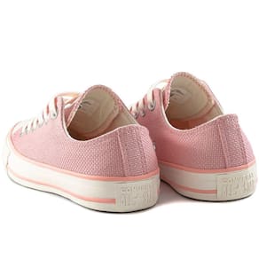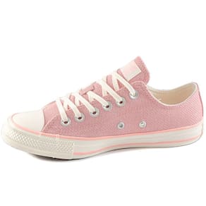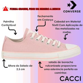 O clássico Chuck Taylor All Star vem nesta edição confeccionado tecido com detalhes com brilho no cabedal. O modelo possui costuras duplas na mesma cor do cabedal, uma tira de tecido no calcanhar conferindo maior suporte ao modelo e ilhoses na cor prateada, com dois ilhoses laterais que permitem uma transpiração adequada aos pés. As linhas da vira de borracha aparecem na mesma cor do cabedal. O icônico logo Converse All Star é aplicado na Heeltab do calcanhar. Por fim, o modelo é finalizado com solado vulcanizado em padrão de diamante.