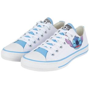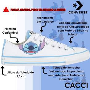 O clássico Chuck Taylor All Star na versão kids recebeu um toque de mágica na colaboração Converse x Disney. Para celebrar uma das animações mais amadas nos últimos 22 anos, Lilo & Stitch, a Converse apresenta a coleção Stich, trazendo referências à criaturinha mais fofa do mundo cinematográfica para o dia a dia dos pequenos. Confeccionado em tecido tipo lona de algodão, o modelo traz o rosto de Stitch aplicado na lateral externa, costuras duplas, uma tira de tecido no calcanhar que proporciona maior suporte ao tênis, forro interno acolchoado para maior conforto e dois ilhoses laterais para uma transpiração adequada aos pés. O logo Converse All Star é aplicado na tag da língua e na heeltab do calcanhar. O solado vulcanizado garante a aderência adequada ao caminhar.
