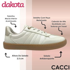 Esse tênis Dakota é a escolha certa para quem procura um calçado que reúne beleza, conforto e durabilidade em cada detalhe, sendo perfeito para acompanhar diferentes momentos da sua rotina com muito estilo. Com um design moderno e versátil, ele combina facilmente com produções casuais e descontraídas, permitindo criar looks cheios de personalidade que se adaptam tanto ao dia a dia quanto a ocasiões mais especiais. O cabedal é confeccionado em material de alta qualidade, trazendo acabamento com texturas em tressê que enriquecem o visual e conferem um toque artesanal e elegante, além de contar com detalhe em peça metalizada que dá ainda mais charme e sofisticação ao modelo. Por dentro, a palmilha macia com interior acolchoado garante uma sensação de conforto a cada passo, permitindo que os pés fiquem bem acomodados durante longos períodos de uso. O solado emborrachado, com altura de 2,5 cm, é antiderrapante e proporciona firmeza e estabilidade em diferentes tipos de solo, oferecendo maior segurança para caminhar sem preocupações. Além de bonito e funcional, esse modelo se destaca por sua durabilidade e acabamento de excelência, sendo ideal para quem deseja unir moda, praticidade e qualidade em um único calçado que valoriza o bem-estar em todos os momentos.