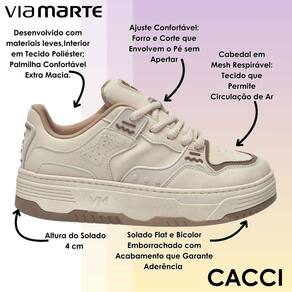 Esse tênis Via Marte foi desenvolvido para quem busca estilo moderno sem abrir mão do conforto. Ele é produzido com materiais leves, possui interior em tecido poliéster que oferece toque macio e agradável e sua palmilha extra macia garante conforto prolongado em qualquer ocasião. O cabedal conta com tecido em mesh respirável que favorece a circulação de ar, mantendo os pés sempre arejados. O forro e o corte envolvem os pés sem apertar, proporcionando ajuste confortável durante o uso diário. O solado flat de 4cm tem acabamento emborrachado bicolor que garante ótima aderência e segurança ao caminhar, além de valorizar ainda mais o visual do calçado. Um modelo versátil, ideal para acompanhar desde momentos casuais até composições mais estilosas, combinando facilmente com diferentes peças do seu guarda-roupa.