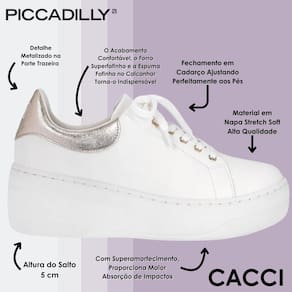 Descolado e confortável. Com o Tênis Morgana Salto Médio Branco, você não precisa sacrificar o conforto em prol da beleza. O branco é super influente no mundo da moda e combina com diferente cores e estampas. Calce Fácil e liberdade no dia a dia, não é preciso usar as mãos para colocá-lo, assim você terá mais segurança ao entrar e sair de casa. Leve e flexível, esse modelo foi pensado nas necessidades de todas as mulheres. Com superamortecimento, ele proporciona maior absorção de impactos. O tênis também oferece máxima absorção controlando tanto umidade quanto temperatura. O acabamento confortável, o forro superfofinho e a espuma fofinha no calcanhar torna-o indispensável para quem precisa ficar horas de pé no trabalho. Já com o WIDE FIT, ele vai deixar os seus pés confortáveis e bem acomodados através de formas com medidas especiais. Adicione um toque de ousadia ao seu look ao combinar o modelo com peças de animal print, como uma saia de oncinha, para um visual fashion e audacioso. PICCADILLY, caminhe em direção ao novo e se surpreenda com o conforto! Você sabia que todos os produtos da PICCADILLY têm o Calce Perfeito? É um conjunto de benefícios exclusivos que respeita a anatomia do pé, diminui o cansaço e permite que você vá mais longe nas suas jornadas diárias.