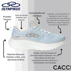 Já o cabedal conta com elementos em degradê para compor o visual do modelo. Possui tecido Jacquard bicolor com perfuros para auxiliar na transpiração, detalhes em high frequency com visual de alto relevo, vista em costura zig e cordão com função de passador para o atacador, feito em poliéster texturizado. Apresenta puxador traseiro em fita para auxiliar no calce e forro em tecido poliéster com espuma. Além disso, possui palmilha plana em poliéster e EVA, com aplicação gráfica. Tecnologias: Evasense -A tecnologia da Olympikus em EVA para máxima maciez e conforto absoluto.