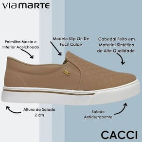 O Tênis Slip On Via Marte Feminino é sinônimo de praticidade e elegância para o dia a dia. Com um design moderno e funcional, ele dispensa cadarços, permitindo um calce fácil e rápido — ideal para quem vive em movimento e não abre mão de estilo. Seu visual clean e atual se adapta perfeitamente a diferentes ocasiões, oferecendo versatilidade sem esforço. O solado flat proporciona firmeza ao caminhar, garantindo estabilidade e segurança em cada passo. O toque de sofisticação fica por conta do detalhe metálico com o logo VM na parte superior, que valoriza ainda mais o design e reforça a identidade da marca. Internamente, o modelo é pensado para oferecer conforto em todos os momentos: o forro em tecido garante respirabilidade, o contraforte acolchoado envolve o calcanhar com suavidade, e a palmilha espumada proporciona uma sensação de maciez a cada pisada. Um tênis pensado para acompanhar você com leveza, conforto e muito charme — do começo ao fim do dia.