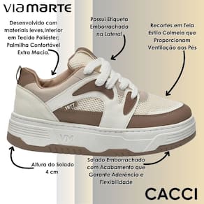 Esse modelo Via Marte combina estilo e conforto em um design moderno que se adapta a diversas ocasiões. Desenvolvido com materiais leves e interior em tecido poliéster, ele garante um calce agradável e macio, enquanto a palmilha foi pensada para oferecer conforto extra durante todo o dia. Seu cabedal traz recortes em tela estilo colmeia, que permitem ventilação aos pés, mantendo a sensação de frescor mesmo em longos períodos de uso. O solado emborrachado com altura de quatro centímetros proporciona estabilidade e flexibilidade, além de garantir ótima aderência em diferentes superfícies, oferecendo segurança a cada passo. Um detalhe que valoriza ainda mais o visual é a etiqueta emborrachada lateral, que reforça a identidade do modelo e adiciona um toque urbano ao design.