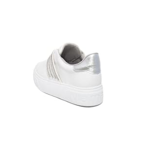 Sintético, parte superior em napa/metalizado. Na cor branco/prata. Forro tecido poliéster.