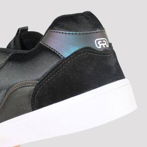 - Cabedal dividido em couro, camurça e tecido mesh;