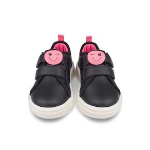Diversão com Patch Removível: O tênis em sintético preto com perfuros ganha um toque de personalidade e alegria com o patch removível de carinha rosa, permitindo que a sua pequena personalize o calçado e mostre seu estilo único! Conforto Onde Quer que Vá: