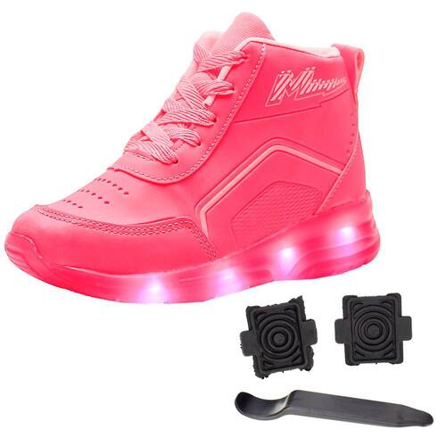 O Tênis Infantil Led Com Rodinha Minipé é confeccionado em material de alta qualidade com acabamento em costura, fechamento por cadarço de amarração, forro interno em têxtil, palmilha em EVA e solado em borracha antiderrapante com luz de LED que acende em cada passo e rodinha removível.