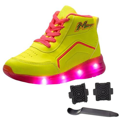 O Tênis Infantil Led Com Rodinha Minipé é confeccionado em material de alta qualidade com acabamento em costura, fechamento por cadarço de amarração, forro interno em têxtil, palmilha em EVA e solado em borracha antiderrapante com luz de LED que acende em cada passo e rodinha removível.