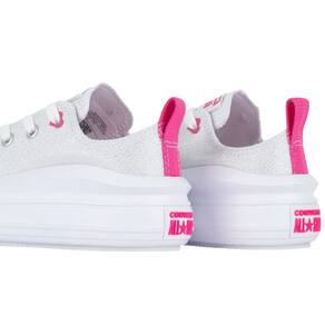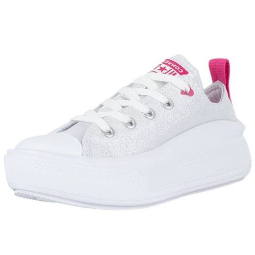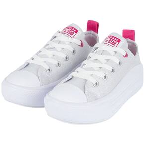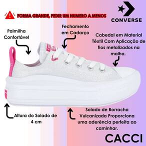 Em sua versão kids, o icônico Chuck Taylor All Star Move chega nesta coleção Be Dazzling com elementos fofos, sendo estrelas, brilho e corações. É confeccionado em tecido tipo Lurex, dando efeito de brilho metalizado ao cabedal. Possui palmilhas em PU feitas com Die-Cut, unidas ao solado plataforma com aproximadamente 3 cm de altura (podendo variar conforme o tamanho do tênis) tipo cupsole feito em EVA que garante um conforto levíssimo. O tênis possui forro interno acolchoado para conferir maior conforto, além de puxador no contraforte para auxiliar no calçar. O logo Converse All Star é aplicado na heeltab do calcanhar. O solado vulcanizado garante a aderência adequada ao caminhar.