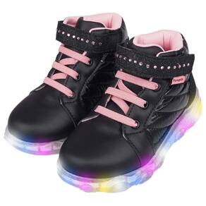 Tênis de led infantil em tecido laminado preto, com detalhes de costuras em matelassê e tira em glitter e strass, super confortável e moderno para os pezinhos! Forro interno que auxilia na absorção do suor e espuma no calcanhar para mais conforto.