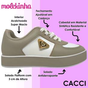 O cabedal em material sintético resistente foi pensado para acompanhar o ritmo das pequenas, oferecendo durabilidade sem perder o conforto. Além disso, sua superfície fácil de limpar torna o dia a dia mais prático, mantendo o tênis sempre bonito por mais tempo. Outro diferencial é o solado flatform com 3 cm de altura, que traz um toque moderno ao visual e ainda proporciona um leve ganho de altura, deixando o look mais estiloso. Para completar, o solado conta com base antiderrapante, que oferece mais segurança ao caminhar, evitando escorregões e garantindo estabilidade em diferentes superfícies.