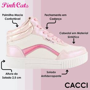 Os detalhes das cores metalizadas e com efeito holográfico são o destaque do modelo, e garantem um toque de glamour e sofisticação. O material sintético de alta qualidade garante durabilidade e conforto para os pés das meninas. Leve e fácil de combinar com diversos looks, o Tênis Pink Cats Infantil de Cano Alto vai ser o novo queridinho das fashionistas!