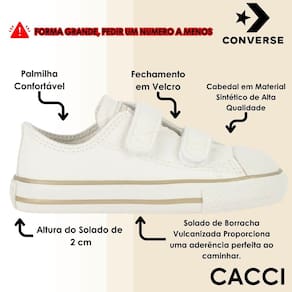 O clássico Chuck Taylor All Star em sua versão kids chega nesta coleção Taylored com inspiração na elegância transmitida pela alfaiataria. É confeccionado em material sintético, possui fechamento autocolante, e puxador no calcanhar para facilitar o calçar. O logo Converse All Star é aplicado na língua, enquanto a Heel Logo é aplicada no calcanhar. O solado vulcanizado garante a aderência adequada ao caminhar.