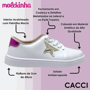 O Tênis Flatform Estrela da Molekinha é perfeito para meninas que adoram estar na moda sem abrir mão do conforto. Com um design moderno e detalhes que encantam, ele é a escolha ideal para compor looks cheios de estilo. Seja no dia a dia ou em momentos especiais, esse tênis vai garantir que sua pequena esteja sempre linda e confortável!