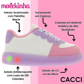 O solado antiderrapante traz mais segurança e estabilidade em diferentes superfícies, ajudando a evitar escorregões e proporcionando passos mais firmes. O grande destaque está nas luzes de LED coloridas que piscam ao caminhar, transformando cada passo em diversão e brilho, conquistando as crianças de imediato. Com altura de dois centímetros e meio, o solado complementa o calçado com estilo e funcionalidade, tornando este tênis uma escolha perfeita para unir conforto, qualidade e um toque de magia.