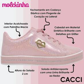 O Tênis Molekinha Infantil Menina Collection Sports apresenta um cabedal confeccionado em material sintético de alta qualidade, proporcionando durabilidade e resistência. Seu formato de bico é arredondado, oferecendo conforto aos pés das pequenas. A coloração é uniforme em toda a peça. O fechamento é realizado por cadarço, garantindo um ajuste seguro. Possui abertura ampla para facilitar o calce. Sua construção ergonômica promove conforto durante o uso, com palmilha macia e calcanheira anatômica. O forro interior é acolchoado, proporcionando sensação de conforto ao caminhar. O solado é feito de material emborrachado, proporcionando aderência e estabilidade. Este tênis combina durabilidade com maleabilidade, permitindo movimentos naturais. Seu estilo é esportivo e moderno, com detalhes decorativos discretos, como logo da marca e detalhes em relevo. Fácil de usar e versátil, é ideal para acompanhar as atividades diárias das crianças com conforto e estilo.