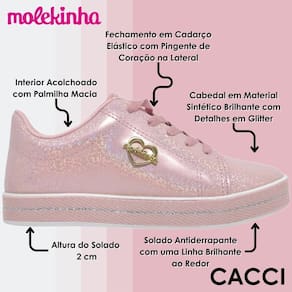 O Tênis Molekinha Infantil Menina Collection Sports apresenta um cabedal confeccionado em material sintético de alta qualidade, proporcionando durabilidade e resistência. Seu formato de bico é arredondado, oferecendo conforto aos pés das pequenas. A coloração é uniforme em toda a peça. O fechamento é realizado por cadarço, garantindo um ajuste seguro. Possui abertura ampla para facilitar o calce. Sua construção ergonômica promove conforto durante o uso, com palmilha macia e calcanheira anatômica. O forro interior é acolchoado, proporcionando sensação de conforto ao caminhar. O solado é feito de material emborrachado, proporcionando aderência e estabilidade. Este tênis combina durabilidade com maleabilidade, permitindo movimentos naturais. Seu estilo é esportivo e moderno, com detalhes decorativos discretos, como logo da marca e detalhes em relevo. Fácil de usar e versátil, é ideal para acompanhar as atividades diárias das crianças com conforto e estilo.