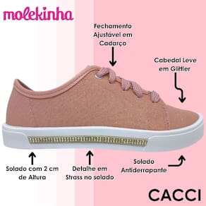 Com o Tênis Molekinha, cada passo é uma combinação de conforto, beleza e personalidade. Um modelo que vai além da estética e entrega funcionalidade, charme e bem-estar em um só produto. Ideal para quem quer se destacar com leveza e autenticidade em todas as ocasiões.