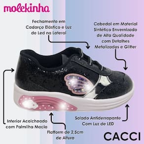 Com o Tênis Infantil Luz da Molekinha, sua pequena vai brilhar em qualquer lugar! Confortável, divertido e cheio de estilo, ele é a escolha perfeita para acompanhar cada passo com muita magia. Garanta o seu e ilumine os dias da sua menina!