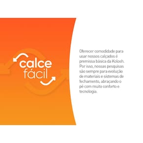 A praticidade é essencial para nosso dia-a-dia, não é? Pensando nisso a Kolosh criou esse modelo de Calce Fácil, com cadarços em elástico. Além de prático e versátil, é macio e confortável, perfeito para todos os momentos do seu dia! Possui uma fôrma projetada para o máximo conforto, com forro interno em tecido.