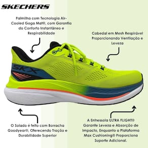 Sua palmilha com tecnologia Air-Cooled Goga Mat® proporciona conforto instantâneo e respirabilidade, mantendo os pés frescos durante todo o uso. O cabedal em material respirável contribui para uma ventilação constante, tornando o calçado leve e agradável mesmo após longos períodos. A entressola ULTRA FLIGHT® oferece amortecimento eficiente e absorção de impacto, enquanto a plataforma Max Cushioning® entrega suporte extra sem perder a sensação de leveza.