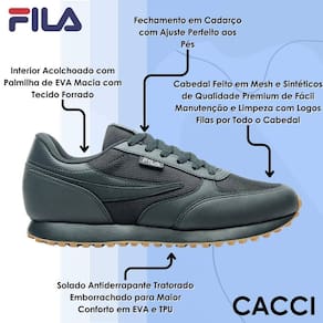 Logos Fila – Com detalhes sutis e sofisticados de logos FILA por todo o cabedal, esse modelo carrega o DNA da marca, com muito estilo.