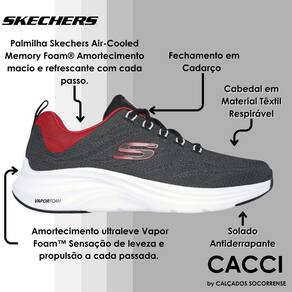 Experimenta conforto leve e estilo elegante usando as Skechers Vapor Foam™ – Varien. Este modelo vegano com atacadores tem a parte superior em tecido de rede especialmente concebido e material sintético, palmilhas Skechers Air-Cooled Memory Foam® e amortecimento ultraleve Vapor Foam™.