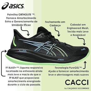 FF BLAST+™: Espuma responsiva localizada na entressola ainda mais leve e macia do que o FF BLAST que proporciona amortecimento energizado durante o ciclo da passada. Palmilha Ortholite X-30™ A palmilha ORTHOLITE ™ fornece amortecimento extra e gerenciamento de umidade eficaz, em versão atualizada X-30. Benefícios: respirabilidade e conforto. Pure GEL ™ A nova versão da nossa tecnologia tradicional GEL, agora mais macio, qual mantém as mesmas propriedades , porém na sua forma mais pura , jamais criada. Atualmente 65% mais leve que a versão anterior, a tecnologia em está localizada principalmente nas áreas de maior carga no momento do impacto. Benefícios: Absorção do impacto, proteção e conforto.