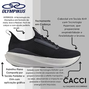 A tecnologia de borracha antiderrapante Gripper traz durabilidade e alta resistência. Além disso, oferece tração superior, tornando-o uma escolha confiável para todas as situações.Tecnologias: Hypersox - A tecnologia da Olympikus em formato de meia, leve e flexível. Fácil de calçar e com ajuste perfeito ao pé. Eleva + -Tecnologia exclusiva Olympikus, que explora o limite de expansão do EVA para alcançar máxima resposta. Este EVA é leve e de baixa densidade, garantindo menor deformação e mantendo o conforto e a durabilidade.Gripper -Borracha antiderrapante que garante melhor aderência.