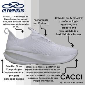 A tecnologia de borracha antiderrapante Gripper traz durabilidade e alta resistência. Além disso, oferece tração superior, tornando-o uma escolha confiável para todas as situações.Tecnologias: Hypersox - A tecnologia da Olympikus em formato de meia, leve e flexível. Fácil de calçar e com ajuste perfeito ao pé. Eleva + -Tecnologia exclusiva Olympikus, que explora o limite de expansão do EVA para alcançar máxima resposta. Este EVA é leve e de baixa densidade, garantindo menor deformação e mantendo o conforto e a durabilidade.Gripper -Borracha antiderrapante que garante melhor aderência.