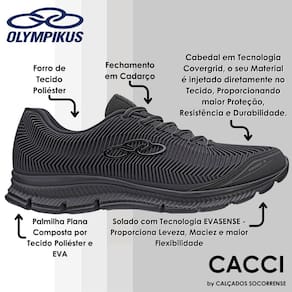 O Olympikus Proof 3 é o tênis ideal para quem busca conforto e alta durabilidade. Seu solado possui design com recortes verticais, que aumentam a flexibilidade, além da tecnologia de amortecimento Evasense, que proporciona leveza e maciez para os corres diários. O cabedal é confeccionado em tecido de poliéster, com a tecnologia Covergrid, o seu material é injetado diretamente no tecido, proporcionando maior proteção, resistência e durabilidade. Possui ainda forro com espuma e atacador bicolor, ambos compostos por tecido poliéster texturizado.
