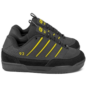 Cabedal em material sintético resistente: Acabamento em preto com detalhes amarelos que valorizam o design.
