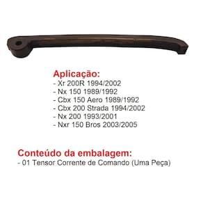 Tensor corrente comando nx150 200 xr200 cbx150 bros150 03-05 Características e benefícios: - tensor de corrente de comando tem a função de manter a corrente de distribuição sob tensão, compensando as vibrações do sistema e o desgaste da corrente. Aplicação; - xr 200r 1994/2002 - nx 150 1989/1992 - cbx 150 aero 1989/1992 - cbx 200 strada 1994/2002 - nx 200 1993/2001 - nxr 150 bros 2003/2005 Conteúdo da embalagem: - 01 tensor corrente de comando uma peça Marca: - thl Tensor corrente comando nx150/nx200/xr200/strada/aero/bros150 10050